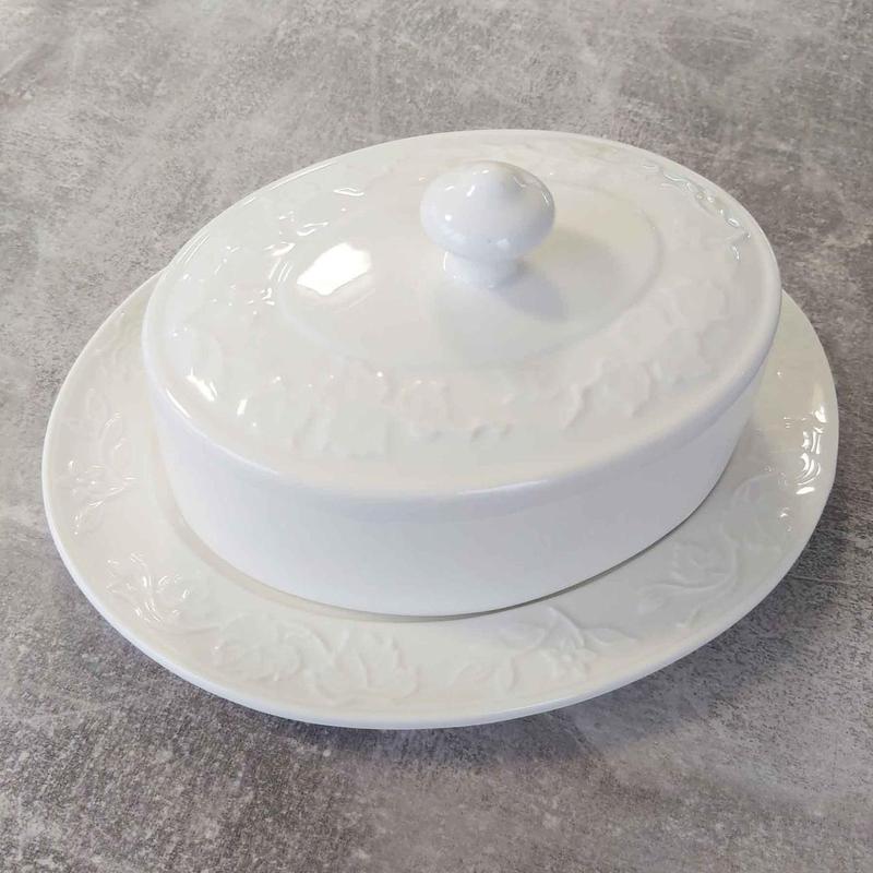Масленка "Зара" Interos D0118 Масленка Зара Interos – это удобное приспособление для хранения сливочного масла в холодильнике, изготовлена из фарфора. Масленка поможет вам сохранять масло в холодильнике дольше, так как оно будет оставаться закрытым. Характеристики: Тип: масленка Серия: Зара Материал: фарфор Форма: овальная Цвет: белый Производитель: Interos Размер: 20 см х 16 см х h-9 см