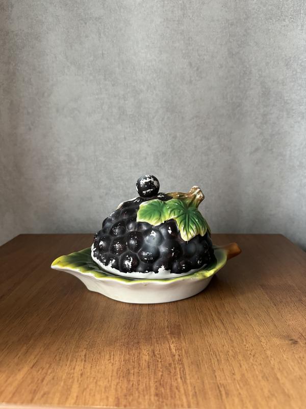 Оригінальна керамічна масленка для вершкового масла у вигляді грона темного винограду. Особливості: • Реалістичне виконання з об'ємними ягодами винограду • Декоративні зелені листочки та завиток лози • Зручна тарілочка-підставка у формі листа • Компактний розмір для домашнього використання • Легко миється та зберігає свіжість масла Ідеально підходить для сервірування столу та як елемент кухонного декору. Масленка поєднує практичність із привабливим зовнішнім виглядом, додаючи особливий шарм вашій кухні.