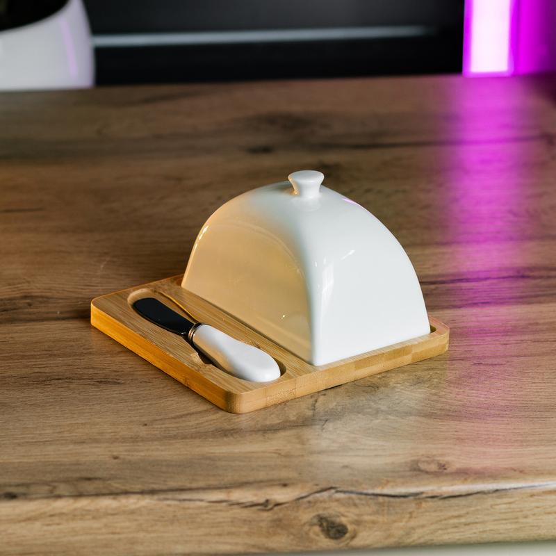 Масленка для сливочного масла с ножом станет прекрасным дополнением к вашей кухне, сочетая функциональность и элегантный дизайн. Она предназначена для удобного хранения и подачи сливочного масла, обеспечивая его свежесть. Основные характеристики масленки: Размер: 15×15×9 см Материал подставки: бамбук Материал крышки: керамика Подробности: Бамбуковая основа прочна и устойчива, придавая масленке натуральный и экологичный вид. Керамическая крышка надежно защищает масло от внешних воздействий, сохраняя его свежесть и аромат. Керамическая поверхность легко моется и долго сохраняет свой первозданный вид. Нож для масла обеспечивает комфортную нарезку и подачу масла, делая процесс использования масленки удобным и приятным. Где купить: Купить керамическую масленку можно с доставкой по всей Украине в нашем интернет-магазине. Она станет отличным дополнением к любому кухонному интерьеру и идеальным подарком для тех, кто ценит качество и эстетику в повседневной жизни.