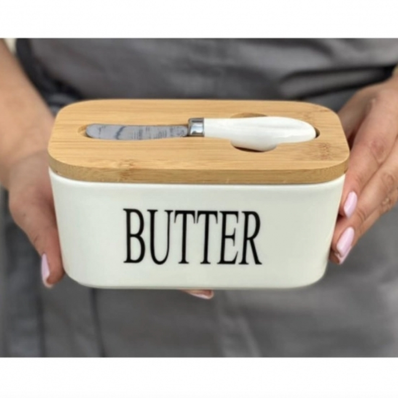 Масленка с ножом, керамическая, белая с бамбуковой крышкой 650мл