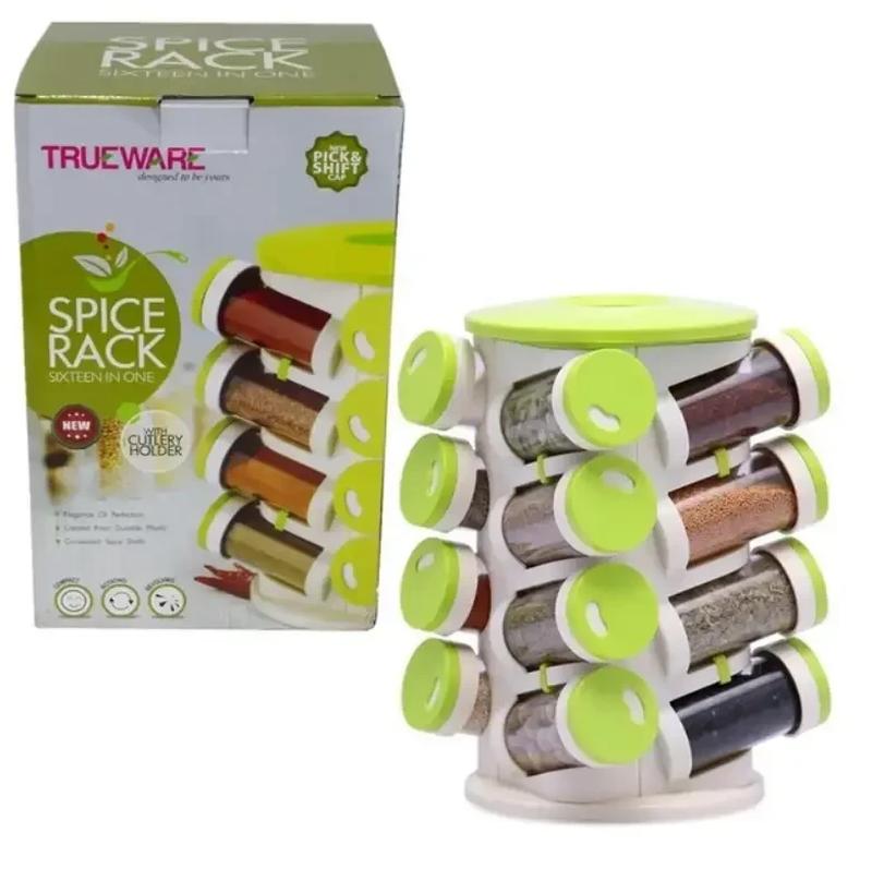 Набор для специй 16 в 1 (SPICE RACK sixsteen in one) Такой набор не оставит равнодушной ни одну хозяюшку, которая любит готовить и хочет, что бы все было под рукой. Набор включает в себя 16 пластиковых контейнеров для самых разнообразных специй. Все виды перцев, травы и другие приправы. Стойка изготовлена из пищевого пластика, легко вращается. Каждый контейнер просто вынимается, моется и наполняется. В самой подставке есть специальное углубление для столовых приборов. Контейнеры можно мыть в посудомоечной машине. Пластик нельзя мыть абразивными моющими средствами или жесткими скребками. Достаточно протереть мягкой губкой и промыть проточной водой. SPICE RACK sixsteen in one имеет привлекательный, непринужденный дизайн и будет отличным дополнением декора для любой кухни. Габариты: Размер стойки: 25*17см Размер бутылочки для специй 10*5см.