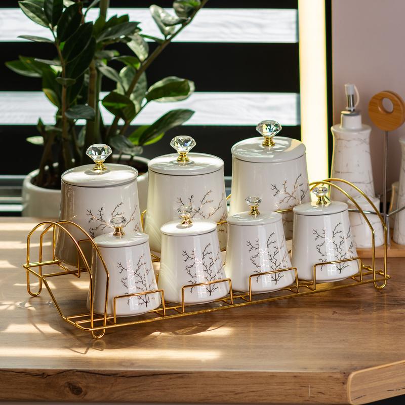 Ищете идеальное решение для организации и хранения специй на вашей кухне? Этот стильный набор баночек для специй не только поможет поддерживать порядок, но и станет элегантным элементом декора. Характеристики: Материал банок: Керамика Материал подставки: Металл Объем баночек для специй: 0.55 л и 0.25 л Преимущества: Герметичные крышки: Крышки каждой баночки обеспечивают герметичное хранение специй, сохраняя их свежесть и аромат, защищая от влаги и посторонних запахов. Золотистая металлическая подставка: Подставка придает набору роскошный вид, компактно размещая все баночки и экономя пространство на вашей кухне. Элегантный декор: Набор не только функциональный, но и стильный, что делает его отличным дополнением к любому кухонному интерьеру. Этот набор станет идеальным помощником в приготовлении блюд и отличным подарком для тех, кто любит готовить и ценит организацию на кухне.