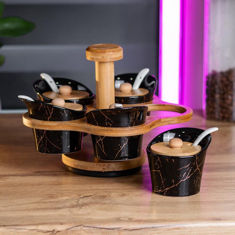 Набір для сипучих продуктів складається з п'яти стильних баночок по 120 мл, що розташовані на елегантній поворотній підставці. Баночки виготовлені з високоякісної кераміки та пофарбовані у розкішний чорний колір з золотими прожилками, що нагадують вишуканий мармур. Такий дизайн додає нотку розкоші та вишуканості будь-якій кухні, роблячи цей набір не лише практичним, а й естетично привабливим. Кожна баночка має бамбукову кришку, яка забезпечує надійне зберігання продуктів, зберігаючи їх свіжими та ароматними. Бамбукова підставка не тільки підкреслює природну красу матеріалів, але й забезпечує зручність використання завдяки своїй функціональності. Поворотний механізм дозволяє легко дістати потрібну баночку, що особливо зручно під час приготування їжі. Додатковим приємним бонусом є керамічні ложечки, які входять до комплекту, що робить процес дозування ще зручнішим. Цей набір стане прекрасним подарунком для тих, хто цінує не тільки практичність, але й естетику на кухні. Він допоможе підтримувати порядок і організованість, додаючи до вашого інтер'єру елемент вишуканості та стилю. Характеристики: Матеріал: Кераміка Матеріал підставки: Бамбук Висота: 17 см Об'єм: 120 мл