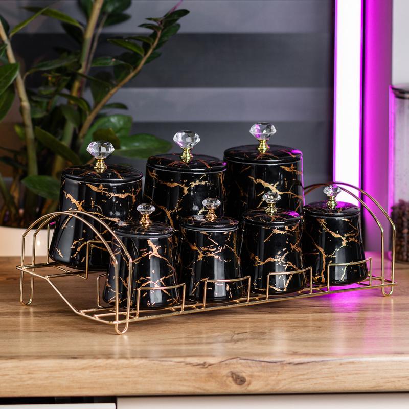 Обновите вид и функциональность вашей кухни с нашим элегантным набором баночек для сыпучих продуктов. В комплект входят три банки объемом 600 мл и четыре банки объемом 250 мл, которые идеально подходят для хранения специй, круп, чая и сахара. Черная керамика с золотистыми прожилками придает им стильный вид, а стеклянные ручки крышек добавляют нотку изысканности и удобства. Металлическая подставка обеспечивает компактное хранение и поддерживает порядок на кухне, подчеркивая элегантность вашего интерьера. Характеристики: Материал банок: Керамика Материал подставки: Бамбук Высота банок: 18 см Объем банок: 600/250 мл Преимущества: Стильный дизайн, дополняющий любой интерьер Удобное хранение и легкий доступ к продуктам Прочность и долговечность керамических банок Уход:Рекомендуется очищать баночки мягкими моющими средствами и теплой водой. Избегайте использования абразивных материалов для сохранения эстетического вида.