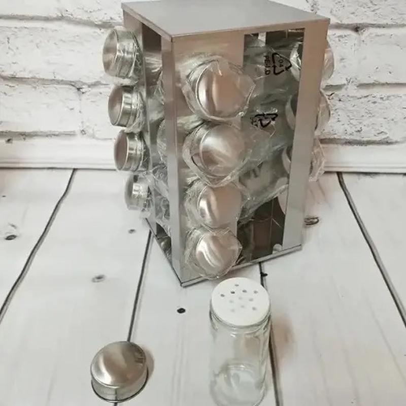 Набір для спецій (спецівниця) на підставці, що крутиться, складається з 17 предметів (підставка квадрат + 16 баночок). Підставка та кришки виконані з високоякісної нержавіючої сталі, банки з ударостійкого скла. Місткість баночки з отворами для висипання 50 мл. та має розміри 43x100 мм. Розміри підставки 170 мм у діаметрі та 200 мм за висотою. Цей набір впишеться в будь-який інтер'єр кухні. Переваги Стильний дизайн Зручна конструкція Достатня ємність Характеристики Колір: сріблястий Розміри: 43х100 мм Країна виробник: Китай Комплектація Підставка Спецівниці