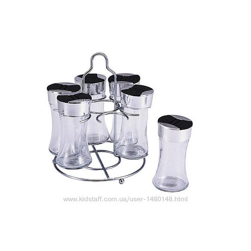 Набор для специй Характеристика: Размер: 10 х 4,5 см - 7 предметов - 6 емкости для специй - Материал: стекло/нержавеющая сталь - Объем: 90 г - Стойка из хромирированной нержавеющей стали Состояние новое, коробка повреждена.