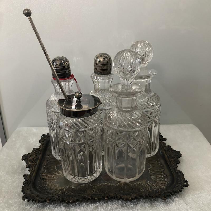 Набір для спецій з кришталю вінтажний з Франції . Без сколів та тріщін. В набір входить таця посріблена ажурна гарна. Ложка для горчиці. Дві сільнички з прсрібленими кінцівками та два флакона для укусу та олії. Стан на фото