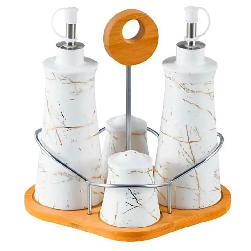 Изысканный набор для специй и жидких текстур станет не только украшением вашей кухни, но и незаменимым помощником в приготовлении блюд. Этот набор включает две баночки для специй и две бутылки для масла и уксуса с дозатором. Характеристики: Материал банок: Керамика Материал подставки: Бамбук Объем баночек для специй: 0.05 л Объем бутылок для масла и уксуса: 0.23 л Преимущества: Керамические бутылки с дозаторами: Обеспечивают точный контроль за количеством наливаемой жидкости и удобство использования при приготовлении блюд. Мраморный дизайн: Придает элементам элегантный и современный вид, идеально вписывается в любой кухонный интерьер. Бамбуковая подставка: Стабилизирует и организует все элементы набора, добавляя стиля и удобства. Легкий уход: Все элементы можно мыть в посудомоечной машине, что облегчает уход за ними. Этот набор станет отличным дополнением к вашей кухне и идеальным подарком для тех, кто ценит гармоничное сочетание красоты и функциональности в быту.