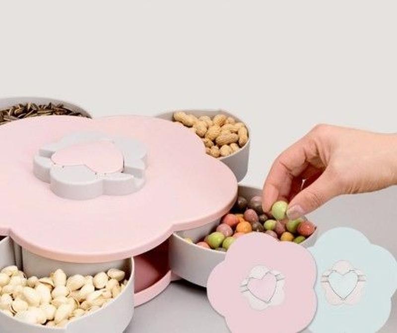 Менажница раздвижная для конфет и мелочей Раздвижная менажница это креативный и запоминающийся подарок как для взрослых, так и для детей! Просто поверните цветочек, расположенный наверху шкатулки и перед Вами раскроются чудесные лепестки, в которые можно сложить конфеты, сухофрукты, орехи, ягоды. Бонусом ко всему, этот "волшебный цветочек" служит подставкой для смартфона. Вы можете лакомиться любимыми угощениями во время просмотра передачи или фильма. Шкатулку можно использовать и в детской комнате, сложите туда все мелкие детальки (лего, пазлы). Бисер, пайетки, пуговки, блестки, всё эт