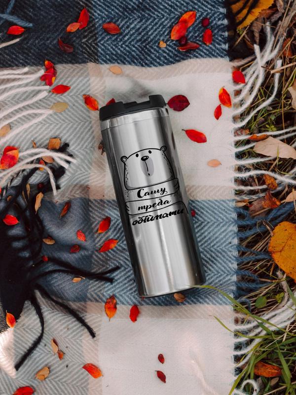 металеві подвійні стінки, об'єм 350мл. Кришка герметична. можна з будь-яким ім'ям