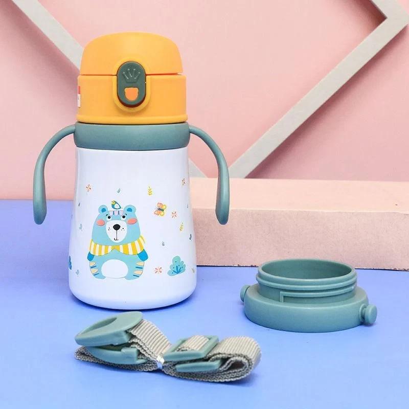 Термос для дитини з трубочкою ручками і ремінцем 360 мл , дитячий термос в школу Дитячий термос із трубочкою стане незамінним для дитини в садочку або школі, під час прогулянки та в дорозі, а також під час кемпінгу та подорожі. Термос виконаний з металу, що забезпечує його надійність і довговічність. Він не боїться ударів і деформацій, що дає змогу брати його навіть у найскладніші умови. У комплектації з термосом йдуть зручні ручки і ремінець. Дно термоса оснащене антиковзаючою силіконовою основою. Термос для дитини має зручну кнопку, яка дає змогу легко відкрити і закрити його за допомогою однієї руки. Це дуже зручно для молодої мами. Маленький термос для чаю в школу або садок має подвійну стінку і подвійне дно, що дає змогу зберігати як холодні, так і гарячі напої. Переваги: - Сучасний стильний і яскравий дизайн. - Зручні ручки та ремінець - Виконаний із безпечної сталі - Зберігає тепло або холод до 12 годин - Невеликий розмір і об'єм 360 мл Дитячий термос стане незамінним аксесуаром і чудовим подарунком для кожної дитини