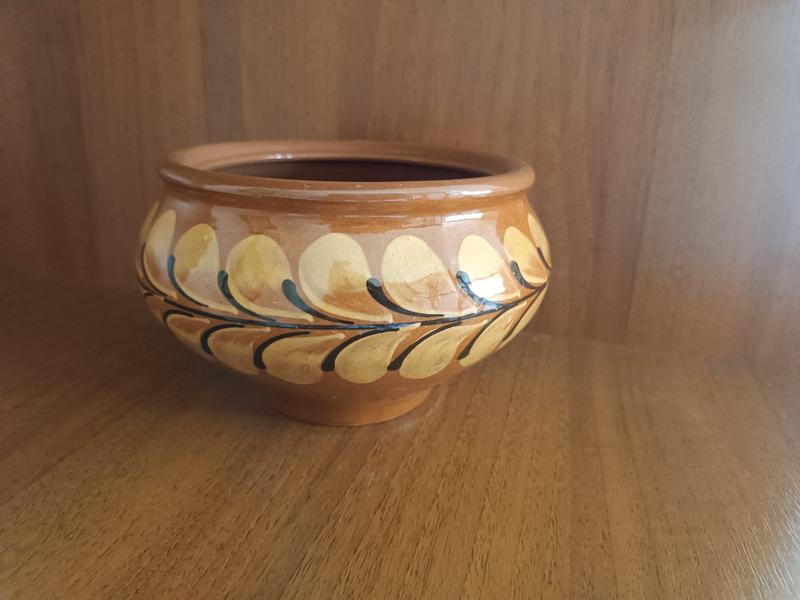 Горщик, діаметр 18см., висота 11 см..Це чудовий приклад традиційної української кераміки. --- 🏺 Керамічний горщик з декоративним орнаментом Матеріал: Глина, глазурована Форма: - Класична округла форма з трохи розширеним верхом - Невелике стійке денце - Внутрішня поверхня гладка, темно-коричнева, з блискучим покриттям Декор: - Орнамент по зовнішньому краю: серія овальних жовтуватих форм, що нагадують листя або пелюстки - Між ними -дрібні чорні крапки, які створюють ритм і контраст - Візерунок нанесений вручну, що додає виробу автентичності Стиль і походження: - це виріб з одного з українських регіонів, де збереглися традиції гончарства -можливо, Опішня, Косів або Слов’янськ - Орнамент нагадує мотиви, які використовувалися в середині XX століття, хоча техніка може бути й старішою Призначення: - Може слугувати як декоративний елемент інтер’єру - Або як функціональний посуд для сухих продуктів, фруктів чи навіть як кашник