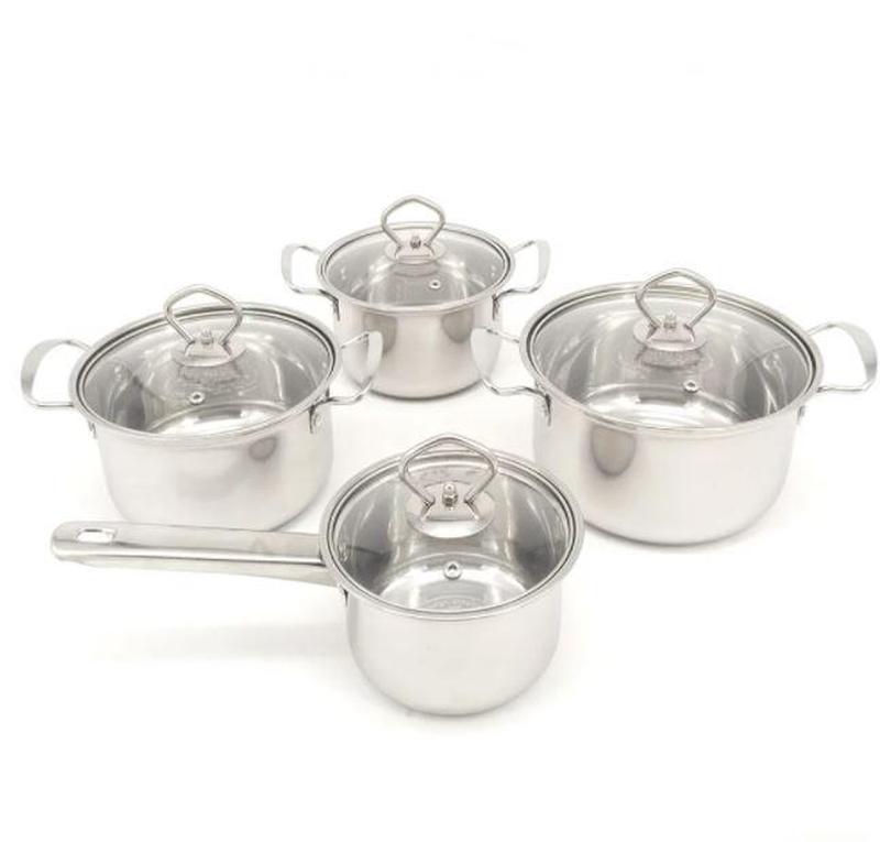 Набор кастрюль 8 предметов изготовлены из высокопрочной нержавеющей стали, не подвергающейся коррозии и потускнению. Нержавеющая сталь отличается высокой теплопроводимостью и распределением температуры. Днище кастрюли капсульное, что способствует равномерному распределению тепла по всему дну. Кастрюли и наборы кастрюль из нержавеющей стали пользуются необычайным спросом у профессиональных поваров и просто любителей вкусно готовить разнообразные кухонные шедевры. Незаменимый набор на кухне каждой уважающей себя хозяйки! Характеристики: - Тип: набор кастрюль; - Материал: нержавеющая сталь; - Крышка: жаропрочное стекло; - Пароотводящее отверствие; - Ручки: нержавеющая сталь; - Ковшик: 14 см., 0.7 л.; - Диаметр кастрюль: 16, 18, 20 см.; - Обьем кастрюль: 1.1, 1.4, 2.0 л.; - Подходит для всех плит; - Капсульное дно. Комплектация: - Кастрюли - 3 шт.; - Ковшик - 1 шт.; - Крышка - 4 шт.; - Упаковка: завдская коробка.
