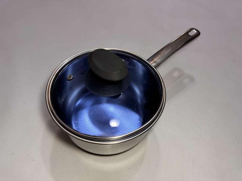 Диаметр 17,5 см, высота 9,5 см, нержавейка. Толстое двойное дно. Ковш тяжелый.