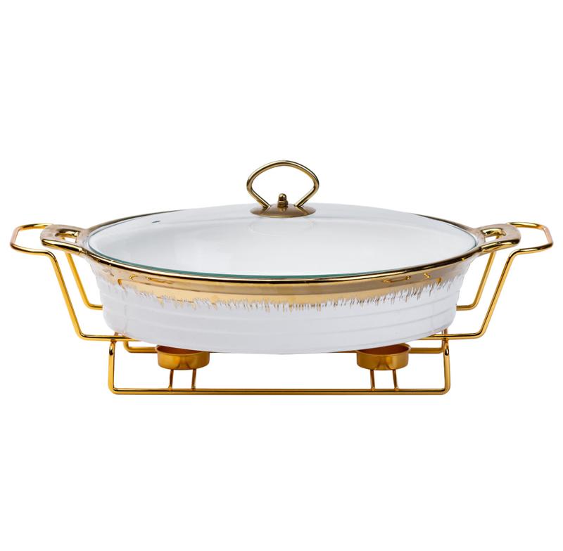 Добавьте элегантности и удобства вашей кухне с нашей керамической овальной мармитницей объемом 2 л. Эта мармитница белого цвета с изысканным золотистым ободком сочетает в себе стильный дизайн и практичность, что делает ее идеальным выбором для любой трапезы. Стеклянная крышка плотно прилегает, сохраняя тепло и ароматы блюда, а также позволяет легко контролировать процесс приготовления. Золотистая металлическая подставка с подогревом поддерживает пищу горячей в течение всего времени, что позволяет наслаждаться блюдами в оптимальной температуре. Эта мармитница, изготовленная из высококачественной керамики, является не только функциональной, но и эстетично привлекательной. Она придаст роскошный вид вашему столу и обеспечит комфорт при каждом потреблении пищи. Характеристики: Размеры: 41.5*25.5*14 см Вес: 2.580 кг Объем: 2 литра Материал: керамика, стекло, нержавеющая сталь