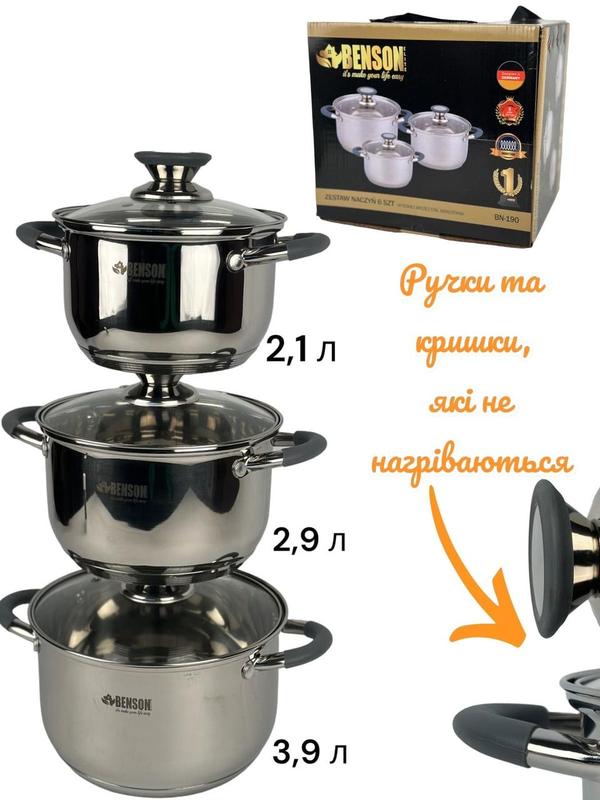 Набір кастрюль Benson, 6 предметів. 3 кастрюлі об'ємом 2.1л, 2.9л і 3.9л, кожна має скляну кришку і силіконові ручки. Матеріал - нержавіюча сталь. Сумісні з індукційними плитами. Упаковка - коробка.