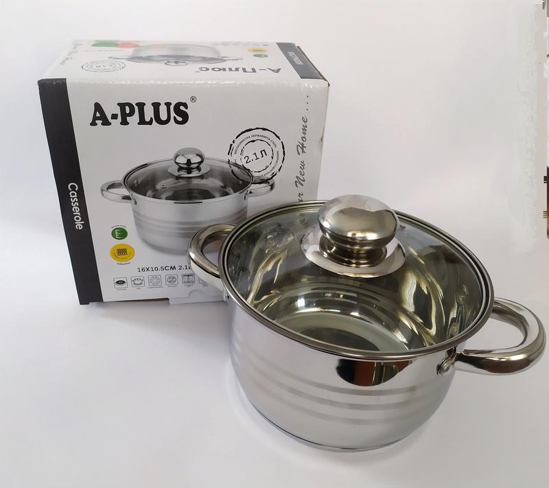 Кастрюля изготовлена из нержавеющей стали и имеет усиленное двойное дно. Подходит для всех видов плит в том числе и индукционные. Крышка выполнена из закалённого стекла и имеет капсюль для выпуска пара. Внутри имеется мерная шкала. Объём (фактический)- 2.0 литра (при наливе до края) Высота - 11 см. Верхний диаметр - 17 см. Диаметр основания - 13.5 см.
