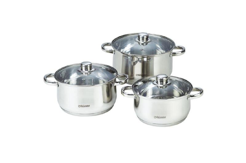 Кастрюля с крышкой 2 л Ø 18 см - 1 шт., кастрюля с крышкой 3 л Ø 20 см - 1 шт., кастрюля с крышкой 4 л Ø 22 см - 1 шт. Возможно использование на всех типах плит, многослойное термоаккумулирующее дно, высококачественная нержавеющая сталь.