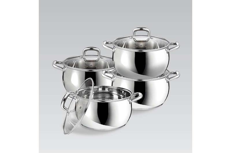 Серия кастрюль Маэстро MR 3515-8. Современный дизайн, блестящая полировка и красивые округлые ручки. Смотрится модно, современно и в то же время уютно. Благодаря округлому дизайну вмещает больше жидкости, чем аналогичные модели с прямыми стенками. В набор входит 8 предметов, 4 кастрюли и 4 крышки к ним