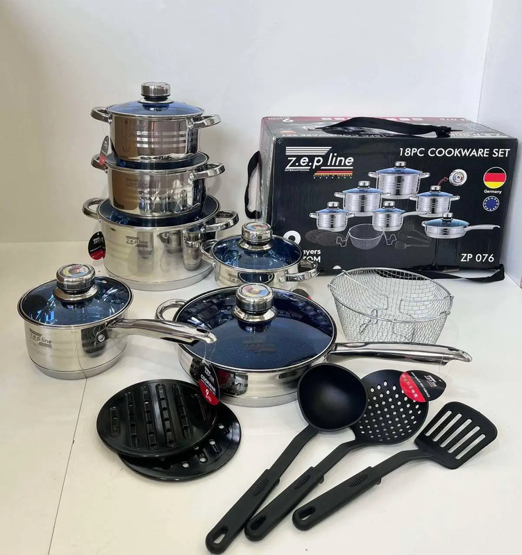 Сковорода с антипригарным покрытием 24х7, 5 см 3.4 л. Ковш Ø 16 х 10.5 см 2,1 л с крышкой Кастрюля Ø 20 х 12,5 см 3,9 л с крышкой Кастрюля Ø 24 х 14,5 см 6.5 л с крышкой Каструля Ø 16 х 1 1 1 см 2.9 л с крышкой Фритюрница (корзина) Половник, Шумовка, Лопатка Подставки под горячее 2 шт. Также очень легко чистится и остатки пищи и жира не собираются в углах. Высококачественная нержавеющая пищевая сталь. Эффект быстрого нагрева и равномерного распределения тепла, что предотвращает пригорание в процессе готовки. Данный набор будет хорошим приобретением для семьи или отличным подарком на свадьбу или на юбилей, день рождения, именины, можно сказать на любом торжестве.