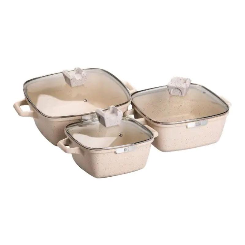 Набор квадратных кастрюль с крышками и толстым дном обеспечивает равномерное распределение тепла и эффективное приготовление пищи. Каждая кастрюля оснащена крышкой из прочного жаропрочного стекла и пароотводом для уменьшения испарения и сохранения тепла. Это делает приготовление пищи еще более удобным и эффективным. Кастрюли можно легко мыть в посудомоечной машине. Основные характеристики набора квадратных кастрюль Кастрюля объемом 3 литра Диаметр 20 см Высота кастрюли без крышки 9,5 см Высота кастрюли с крышкой 14,5 см Кастрюля объемом 4,7 литра Диаметр 24 см; Высота кастрюли без крышки 10,6 см Высота кастрюли с крышкой 15,6 см Кастрюля объемом 7,3 л. Диаметр 28 см; Высота кастрюли без крышки 11,8 см; Высота кастрюли с крышкой 16,8 см. Этот набор сотейников подходит для всех типов плит - индукционных, газовых и электрических, что делает его универсальным решением для любой кухни. Алюминиевая кастрюля - надежный помощник в приготовлении вкусной и здоровой пищи для всей семьи.