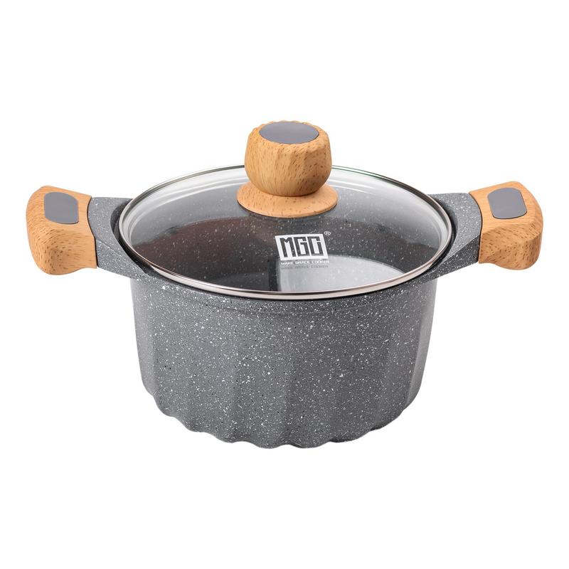 Кастрюля из алюминиевого сплава станет отличным дополнением к вашей кухне благодаря своему современному дизайну и функциональности. Мраморное антипригарное покрытие обеспечивает равномерный нагрев и предотвращает пригорание пищи, что делает ее идеальной для ежедневного использования. Объем 3 литров позволяет готовить не большие порции блюд. Кастрюля легко чистится благодаря антипригарному покрытию, что также повышает ее долговечность. Вы сможете наслаждаться приготовлением любимых блюд без лишних усилий по уходу за посудой. Основные характеристики кастрюли Объем 3 л Диаметр 20 см Высота сковороды без крышки 11,7 см Высота кастрюли с крышкой 16,7 см; Толщина дна 5 мм. Преимущества кастрюли. Подходит для газовых, электрических и индукционных плит; Не вступает в реакцию с пищей; Имеет толстое дно для идеального распространения тепла. Меры предосторожности Перед первым использованием вымойте в теплой воде с мягким моющим средством, протрите губкой и вытрите насухо. После полного высыхания протрите антипригарное покрытие небольшим количеством растительного масла. Используйте силиконовые или деревянные столовые приборы, чтобы защитить поверхность от царапин. Категорически не рекомендуется использовать металлические ложки или лопатки. Не оставляйте пустую кастрюлю на огне. Не используйте жесткие губки и щетки, абразивные пасты и порошки, а также агрессивные чистящие средства.