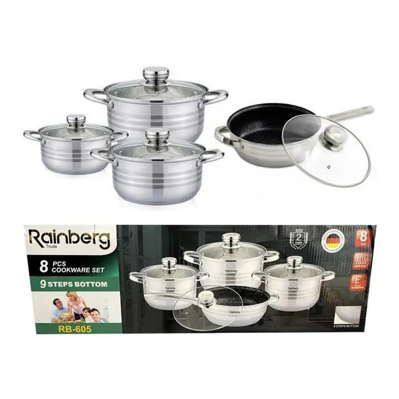 Набір каструль Rainberg RB-605 з 8 предметів Даний набір порадує будь-якого кухаря або домогосподарку своєю практичністю та зручним використанням. У ньому Ви знайдете: три каструлі, сковорідку та кришки. Це великий і якісний набір, виготовлений з екологічно чистої нержавіючої сталі. Посуд оснащений скляними кришками. Капсульне, індукційне дно швидко прогрівається і рівномірно розподіляє тепло. Після використання Ви зможете помити каструлі та інші вироби з набору самостійно або відправити в посудомийну машину. Особливості: Приємна на дотик поверхня. Класичний, красивий дизайн. Ергономічні ручки. Характеристики: Тип: набір; Матеріал: високоякісна нержавіюча сталь 1810; Кількість: 8 шт; Дно: капсульне 9-шарове, індукція; Мірна шкала; Можна мити в посудомийній машині. Комплектація: Каструля 1,8 л з кришкою. Каструля 3,1 л з кришкою. Каструля 6,3 л з кришкою. Сковорідка з антипригарним покриттям Ø24 х 6.5 см 2,9 л з кришкою. Коробка.