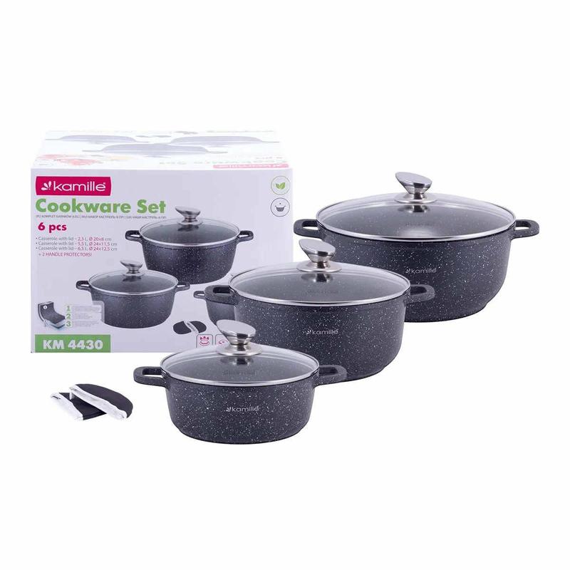 Набор посуды 9 предметов Kamille KM-4430 из литого алюминия Характеристики: - Количество предметов в наборе: 7 предметов. - Материал кастрюль: литой алюминий. - Материал крышки: жаропрочное стекло с металлическим ободком, с отверстием для выхода пара. - Материал прихваток: хлопок+текстиль. - Антипригарное покрытие: 3 -х шаровое мраморное. - Тип ручек: литые. - Цвет: черный мрамор. - Тип плиты: электрическая, стеклокерамическая, газовая, индукционная Комплектация: - кастрюля из крупышек 2.3 л (Ø 20 х 8 см) - 1 шт - кастрюля с крышкой 4.5 л (Ø24 х 11.5 см) - 1 шт - Кастрюля с крышкой 6.5 л (Ø28 х 12.5 см) - прихватки - 2 шт.; Особенности: - литой алюминий с увеличенной толщиной стенки, цельно литые ручки - идеален для интенсивного использования, устойчив к износу - 3-х шаровое, мраморное антипригарное покрытие - отличается высокой теплопроводностью и распределением температуры, что обеспечивает быстрый нагрев и длительное удержание тепла - пригоден для любых видов плит - пригоден для мытья в посудомоечной машине - удобен в использовании и уходе Уход за посудой: - после каждого использования дождаться охлаждения изделия, затем тщательно вымыть и просушить - не рекомендуется использовать абразивные моющие средства и металлические щетки Использование и правила безопасности: -не подвергать изделию резким изменениям температуры - не оставлять чистую посуду на огне - избегать попадания пламени на ручки и боковые стенки посуды - не использовать острые металлические аксессуары