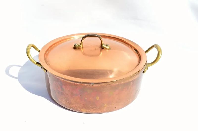 Медная кастрюля от всемирно известной фирмы "Tagus Chef" Экологически чистая посуда для приготовления здоровой пищи. Материал - медь, сталь, бронзовая ручка. Объем - 1,2 л. Состояние замечательное, с незначительными следами пользования. Крышка скорее всего была подобрана, она отлично подходит, но не идеально ложится)