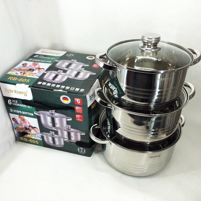 Данный набор порадует любого повара или домохозяйку своей практичностью и удобным использованием. В нём Вы найдете: три кастрюли большие и крышки к ним . Это большой и качественный набор, изготовленный из экологически чистой нержавеющей стали. Посуда оснащена крышками стеклянными . Капсульное, индукционное дно быстро прогревается и равномерно распределяет тепло. После использования Вы сможете помыть кастрюли и другие изделия из набора самостоятельно или отправить в посудомоечную машину. Особенности набора кастрюль Reinberg RB-605 - Можно использовать на любых типах варочных поверхностей включая индукцию - Классический, современный дизайн - Эргономичные ручки Комплектация набора кастрюль Reinberg RB-605 - В комлпекте Кастрюля 9,4л с крышкой, - Кастрюля 7,1 л с крышкой , - Кастрюля 6,3 л с крышкой Характеристики набора кастрюль Reinberg RB-605 - Тип: набор - Материал: высококачественная нержавеющая сталь 18\10 - Количество: 6 шт - Дно: капсульное 9-тислойное, индукция - Можно мыть в посудомоечной машине - Упаковка: подарочная