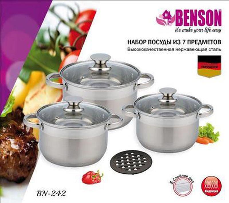 Набор кастрюль из нержавеющей стали Benson BN-242 Посуда выпускаемая немецким брендом Benson завоевала доверия покупателей не только у себя на родине, но и в других странах Европы и Украины. Benson — это долговечность и надёжность! Кастрюля Benson изготовлена из нержавеющей стали. Крышки выполнены из жаропрочного стекла с клапаном для отвода пара. Ручки стальные на клёпочном соединении, зарекомендовали себя тем, что ручки не нагреваются вместе с корпусом кастрюли. Кастрюля подходит для всех типов плит, включая индукцию. Можно мыть в посудомоечной машине. Комплектация набора: Кастрюля со стеклянной крышкой: объём 5,1 л Кастрюля со стеклянной крышкой: объём 6.5 л Кастрюля со стеклянной крышкой: объём 8.5 л Жаропрочная балитовая подставка