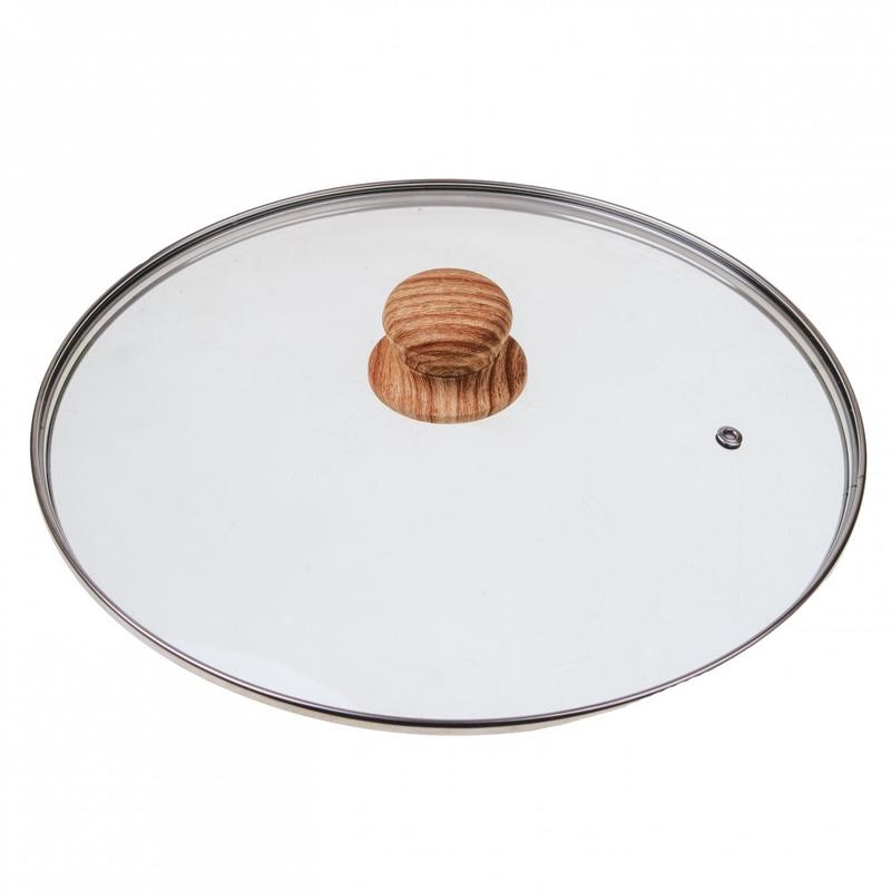 Кришка скляна з діаметром 30 см – ергономічний і вкрай необхідний предмет на будь-якій кухні. Виготовлена вона з загартованого скла. Прозора кришка обладнана отвором для виходу пари, металевим ободком і бакелітовою ручкою з покриттям, що імітує дерево. Модель стійка до перепадів температури. Досить великий діаметр виробу дозволяє застосовувати його з будь-яким посудом – каструлями, пательнями та сотейниками відповідного розміру.