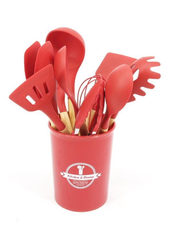 Кухонний набір,незамінний надійний помічник на Вашій кухні, є 11 необхідних предметів для кожної хазяйки і відерце для зберігання. Він виготовлений з харчового, термостійкого, антипригарного силікону і добре відполірованого натурального дерева. Безпечний для використання з харчовими продуктами, нетоксичний, без запахів, витримує температуру до 230°С. Кожен аксесуар виконаний з міцного і гладкого високоякісного дуба з антибактеріальними властивостями, використати які безпечно і комфортно і надтермостійкого нетоксичного силікону преміум-класу, який захищає Ваш посуд від подряпин. На дні відерця для приладдя є отвір, який забезпечує сухість усіх аксесуарів, а також запобігає утворенням слизу і плісняви. Комплектація: Пензлик - для рівномірного розподілу олії на сковороді, деку або маринування м'яса Щипці - для сервіровки або приготування їжі Вінчик - для змішування соусів, збивання яєць, вершків і крему Ложка з прорізом - для приготування і проціджування супів, соусів Ополоник - для подання супу, рідких блюд і соусів Ложка для спагетти - для приготування і подання спагетти Ложка сервіровки - для приготування і подання супів Лопатка з прорізом - для жаріння і сервіровки з проціджуванням Лопатка - для перемішування, жаріння, приготування на грилі і сервіровки їжі Ложка для салату - для перемішування і подання салатів Лопатка для нанесення - для розподілу олії, джему і іншого Відерце для зберігання Кухонний набір зробить процес приготування їжі простим, комфортним, легким і безпечним, а яскравий і насичений колір стане відмінною прикрасою Вашої кухні.