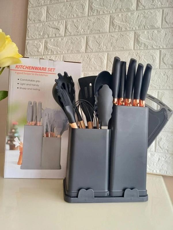 Набор кухонных принадлежностей 19 предметов с двойной подставкой доской набором ножей Черный Кухонный набор на подставке из 19 предметов (включая двойную эргономичную подставку) изготовлен из качественного материала, который не поддается коррозии, не меняет цвет и не влияет на вкусовые качества блюд. Легкие и удобные ручки приборов изготовлены из дерева, а основание из мягкого, термостойкого силикона. Приборы имеют подвесное отверстие, благодаря которому можно подвесить их в любом удобном месте. Рукоятки ножей и ножниц изготовлены из пластика. Также в наборе есть разделочная доска, которая удобно размещается на подтавке вместе с остальными приборами. Особенности: Мягкий силикон Деревянные ручки Подвесное отверстие Острые и прочные ножи Наличие разделочной доски Удобная и компактная подставка особенности: Тип: набор кухонных приборов Материал: дерево, пластик и термостойкий силикон Размер подставки: 23,5 х 21 см Размер разделочной доски: 33 х 20 см Цвет: Черный Состав набора: Подставка Обробна дошка Поварской нож 32 см Универсальный нож 32 см Нож для хлеба 32 см Универсальный нож 23 см Нож для фруктов 19 см Ножницы Вторая рука Скребкова ложка Скребкова лопатка Венчик Силиконовая кисточка Ложка для спагетти Супова ложка Шумовка Лопатка для жарки Лопатка для холодных блюд Щипцы для мяса