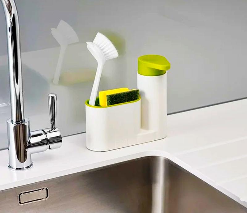 Органайзер для кухни и ванной Sink Tidy Sey Plus 2 в 1. Уют, красота и гармония дома зависят от мелочей! Практичный и компактный органайзер с дозатором для мыла и подставкой для кухонной утвари или зубных щеток Sink Tidy Sey Plus 2 в 1 прекрасно дополнит интерьер, не выделяясь из общего стиля. Органайзер для мойки с дозатором для мыла Sink Tidy Sey - очень компактный и удобный в использовании. Благодаря компактному дизайну данный органайзер может быть размещен даже на узкой стороне раковины. Теперь пространство по кухонной раковине будет использоваться с максимальной эффективностью! Органайзер Sink Tidy Sey предложен в белом цвете с зеленой крышкой. В нем предусмотрена подставка с двумя отделениями для щеток и губок и дозатор для мыла. Все что необходимо - присущая в одном наборе. Это очень удобно, а потому каждая хозяйка придет в восторг от такого презента. Данный органайзер не предназначен для мытья в посудомоечной машине, поэтому его чистку рекомендуется проводить только вручную. Впрочем, это не проблема, так как органайзер очень легко разбирается. Размеры: 27 x 5.8 x 16.4 см; Вес: 267 г