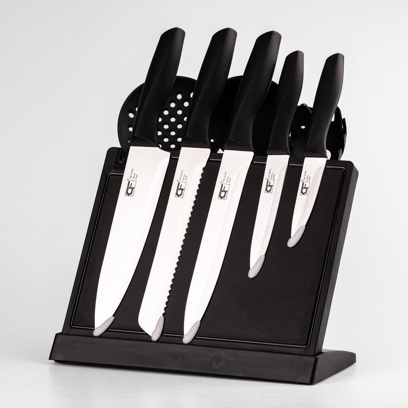 Набор кухонных принадлежностей - это незаменимый помощник для любой хозяйки на кухне. Ножи изготовлены из стали 5CR15, что обеспечивает долговременную остроту, а их лезвия имеют алмазную заточку и керамическое покрытие для более легкой обработки продуктов. Ручки выполнены из высококачественного полипропилена, эргономично оформлены для удобного захвата. В набор входят: Поварской нож Нож для хлеба Нож для мяса Нож для овощей Ложка-шумовка Ополоник Ложка для спагетти Лопатка Характеристики: Материал ножей: Сталь 5CR15 Лезвие: Алмазная заточка, керамическое покрытие Ручка: Полипропилен, эргономичная форма Размер ножей: 33 см, 24 см, 20 см Преимущества: Длительная острота благодаря алмазной заточке Легкость обработки продуктов благодаря керамическому покрытию Комфортный захват благодаря эргономичным ручкам Уход: Рекомендуется мыть вручную с использованием моющих средств Сушить на воздухе после мытья для предотвращения коррозии
