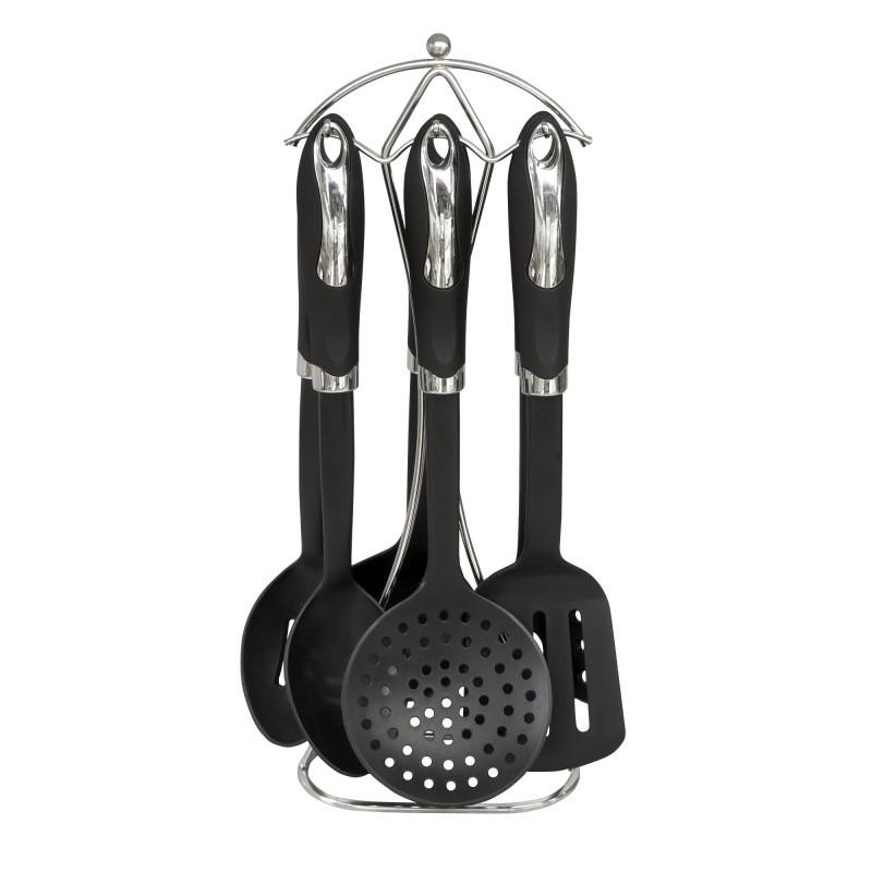 Набір кухонного начиння на стійці 7 предметів – практичний набір, необхідний на кожній кухні. Він складається з підставки, лопаток, ложок, шумівок. Кухонне приладдя виготовлені з нейлону, який відрізняється міцністю і стійкістю до високих температур. Такий набір зручний у використанні, оскільки всі необхідні предмети завжди знаходяться під рукою. Лопатки відмінно підходять для сковорідок з антипригарним покриттям, а шумівка допоможе вийняти з каструлі продукти або зняти пінку. В інтернет-магазині Lora ви можете купити кухонний набір, за допомогою якого ви будете легко і з задоволенням готувати улюблені страви.
