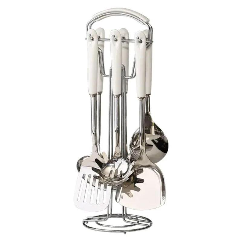 Набор кухонных принадлежностей состоит из семи предметов, изготовленных из нержавеющей стали. Рабочие части изделий обеспечивают устойчивость к коррозии и износостойкость во время использования. Керамические ручки выполнены в классическом стиле и обеспечивают удобный хват. Основные характеристики: Количество предметов в наборе: 7 шт.; Материал приборов: нержавеющая сталь, керамика. Размеры: высота лопатки: 34 см; высота лопатки с прорезью: 35 см; высота шумовки: 34.5 см; высота половника: 31.5 см; высота шумовки для спагетти: 30.5 см; высота ложки: 26.5 см. В комплект входят основные кухонные инструменты, необходимые для приготовления и подачи блюд. Форма и размер каждого предмета адаптированы для эффективного использования, а гладкая поверхность способствует легкому уходу. Конструкция ручек предусматривает прочное соединение с металлической частью, что повышает надежность приборов. Набор дополнен металлической подставкой, которая позволяет удобно организовать хранение предметов. Компактное расположение инструментов на подставке способствует экономии места на кухне и обеспечивает быстрый доступ к необходимому прибору во время приготовления пищи.