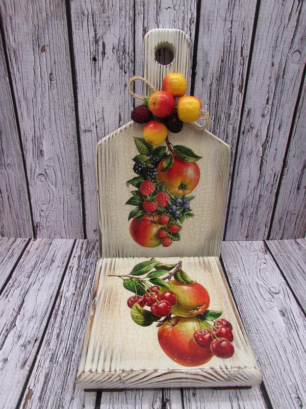 Набір для кухні: дошка для подачі та нарізки,підставка під гаряче. Набір виконаний у техніці декупажу. Набір покритий лаком, який витримує високу температуру. Підставка має дерев′яні ніжки для зручності. Дошка прикрашена мотузкою зі штучними фруктами. Такий набір прикрасить будь-яку кухню, а також буде оригінальним подарунком для близьких та друзів. Матеріали використані в роботі на водній основі. Чи не шкідливі для здоров′я оточуючих. Матеріал: сосна В налiчii 2 шт Розмiр:дошка-14,5х24,5х2 см,підставка -14х14х2 см