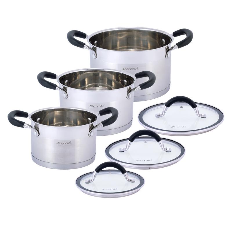 Набор кастрюль Kamille с силиконовыми ручками -- это основные кухонные принадлежности, которые являются наиболее важными элементами на кухне. Набор содержит кастрюли разных размеров , что позволяет готовить аппетитные блюда из множества ингредиентов. Такие кастрюли это всегда вкусное и здоровое приготовление пищи. Кастрюли выполнены из качественной нержавеющей стали с применением современных технологий производства. Такие кастрюли имеют прекрасный внешний вид, оснащены капсульным дном и отличаются высокой прочностью и долговечностью в использовании. Материал: нержавеющая сталь c силиконовыми вставками на ручках. Крышка: жаропрочное стекло. Количество предметов в наборе: 6. Комплектация: кастрюли 2л (Ø16*11см), 2.7л (Ø18*11.5см), 3.7л (Ø20*13см). Т Тип дна: капсульное. Мерная шкала: да. Способ крепления ручек: клепочное. Тип ручек: полые. Крышка с отверстием для выхода пара: да. Полировка металла: зеркальная/сатин. Тип плиты: электрическая, стеклокерамическая, индукционная, газовая. Подходит для мытья в посудомоечной машине: да. Упаковка: цветная картонная коробка 26,5*26,5*21,5см. Особенности: - изготовлены из высокопрочной нержавеющей стали, не подвергающейся коррозии и потускнению - идеальны для интенсивного использования, устойчивы к износу - отличаются высокой теплопроводимостью и распределением температуры, что обеспечивает быстрое нагревание и длительное удержание тепла - внутри всех кастрюль есть мерная шкала - соединение ручек выполнено клепочным способом - на каждой крышке предусмотрено отверстие для выхода пара - внешняя поверхность с зеркально-сатиновой полировкой - подходят для всех видов плит - подходят для мытья в посудомоечной машине Уход за посудой: - перед началом использования необходимо удалить с изделия все ярлыки и элементы упаковки, тщательно вымыть изделие и просушить - после каждого использования дождаться охлаждения изделия, затем тщательно вымыть и просушить - не рекомендуется использовать абразивные моющие средства и металлические щетки Использование и правила безопасности: - не подвергать изделия резким изменениям температуры - не оставлять пустую посуду на огне - избегать попадания пламени на ручки и боковые стенки посуды - не использовать острые металлические аксессуары