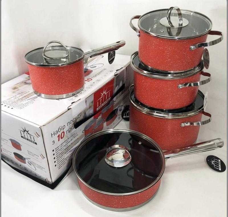 Набор посуды 10 предметов ASTRA A-2510, набор кастрюль с антипригарным покрытием, красивые кастрюли Набор посуды ASTRA изготовлен из высококачественной нержавеющей стали 18/10 (18% Хром & 10% Никель) такой материал делает наборы прочными и долговечными. Посуда в отличие от других видов металлической посуды не влияет на вкус готовящейся пищи. Все емкости имеют зеркальную полировку снаружи и матовое внутри. Пятислойное капсульное дно не деформируется при нагревании и обеспечивает быстрое и равномерное распределение тепла. Ручки кастрюль клепки, удобно расположенные, эргономичные. Стеклянные крышки с отверстием для выхода пара позволят контролировать весь процесс приготовления в оптимальном режиме. ПЕРЕВАГИ: Количество предметов:10 шт П’ятишарове капсульне дно Материал: нержавеющая сталь Крышка :стекло/металл Практичные ручки Гранитное покрытие-красный гранит Мерная шкала внутри емкостей Подходит для всех типов плит Подходит для мытья в посудомоечной машине КОМПЛЕКТАЦІЯ: Кастрюля с крышкой: диаметр 18×10.5 см, объем 2.6 & л Кастрюля с крышкой: диаметр 20×11.5 см, объем 3.6 л Кастрюля с крышкой: диаметр 24×13.5 см, объем 6.1 л Ковш с крышкой: диаметр 16×9.5 см,объем 1.9 л Сковорода с антипригарным покрытием: диаметр 24×6.5 см,объем 2.9 л