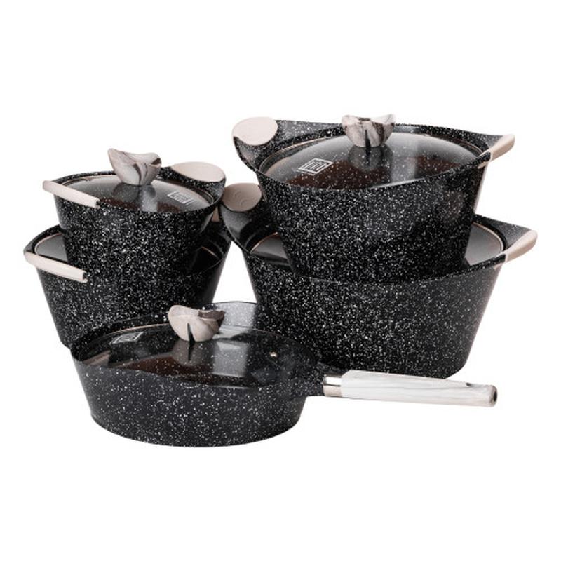Набор посуды MGC 5 предметов с антипригарным покрытием 2,5/5/7/9 л, черный Набор посуды с антипригарным мраморным покрытием - универсальное решение для любой хозяйки. Предметы из набора изготовлены из литого алюминия, имеют утолщенное дно, которое равномерно нагревается и обеспечивает оптимальное распределение тепла. Основная особенность этого кухонного комплекта - возможность приготовления вкусной и здоровой пищи с минимальным использованием животных и растительных жиров. Для удобства использования в наборе есть стеклянные крышки с отверстием для выхода пара, позволяющие контролировать процесс приготовления с сохранением температуры. В набор входят: - Кастрюля 20 см (2,5 л) - Кастрюля 24 см (5 л) - Кастрюля 28 см (7 л) - Кастрюля 32 см (9 л) - Сковорода 28 см (2,5 л) Особенности использования: 1. Перед первым применением вымыть предметы в теплой воде с мягким моющим средством и губкой, и высушить. 2. Для мытья после использования не следует применять жесткие мочалки, скребки, абразивные и агрессивные вещества. Для удаления пригоревших частичек пищи и нагара следует замочить посуду в теплой воде. Приступать к мытью следует только после ее остывания. 3. Мыть емкости в посудомойке рекомендуется на щадящем режиме. 4. Во время приготовления категорически не рекомендуется использовать металлические лопатки и ложки во избежание появления царапин, которые могут повлечь утрату антипригарных свойств. 5. Не следует подвергать кастрюли и сковороду перепадам температур. Чтобы избежать появления микротрещин, не стоит ставить посуду из холодильника на горячую плиту, помещать в разогретую емкость холодные ингредиенты и т.д. 6. Характеристики: 7. Материал: алюминий 8. Материал крышки: закаленное стекло 9. Тип дна: композитное многослойное 10. Высота стенок: 9/12/16/18/20 см 11. Толщина стенок: 5 мм 12. Толщина дна: 5 мм 13. Подходит для газовых, индукционных и электрических плит