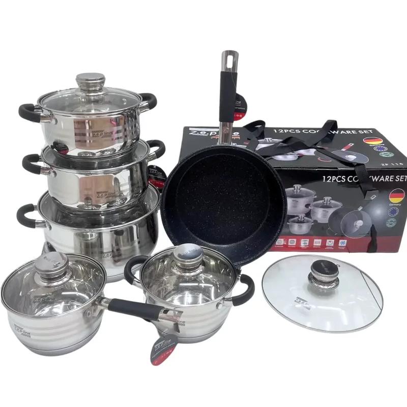 Описание Набор посуды из нержавеющей стали Zepline ZP-115 12 предметов Создавайте комфорт и стиль на вашей кухне с набором посуды Zepline ZP-115! Этот элегантный набор идеально сочетает функциональность и современный дизайн. Изготовленный из высококачественных материалов Zepline ZP-115 гарантирует долговечность и легкость в уходе. Набор включает в себя все необходимое для приготовления и подачи блюд: кастрюли, сковороду, а так же сотейник с ручкой подходящие как для ежедневного употребления, так и для особых случаев. Уникальный современный стиль и разнообразие цвета позволяют этому набору легко вписаться в любой интерьер. Подарите себе и близким радость кулинарных открытий с набором посуды Zepline ZP-115 - идеальный помощник на вашей кухне! Особенности: - Высококачественные материалы - Современный дизайн - Легкость в уходе - Подходит для всех видов плит - Ручки с силиконовыми накладками Характеристика: - Страна производитель - Китай - Количество предметов в наборе - 12 шт. - Материал - нержавеющая сталь 18/10 - Тип дна - Многослойное - Крышки -- Жаропрочное стекло - Ручки крепятся надежными заклепками - силиконовые накладки (не снимаются) - Кастрюля с крышкой 16 х 10,5 см - 2,6 л - Кастрюля с крышкой 18 х 11,5 см - 3,0 л - Кастрюля с крышкой 20 х 12,5 см - 4,0 л - Кастрюля с крышкой 24 х 14,5 см - 6,5 л - Сотейник с крышкой 16 х 10,5 см - 2,1 л - Сковорода с антипригарным покрытием с крышкой 24 х 7.5 см - 3,5 л. - Упаковка - картонная коробка
