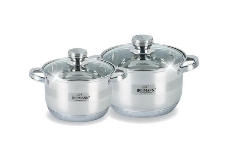 ## Набор посуды BOHMANN BH 04-275 4 пр. Набор посуды BOHMANN BH 04-275 из 4 предметов со стальными ручками. Посуда BOHMANN имеет роскошный блестящий вид, легко моется. На внутренней поверхности нанесена мерная шкала, что упрощает хозяйкам жизнь. Удобно хранить отдельные элементы набора сложив их один в другой, или подвесив за ручку. ### Характеристика набора посуды BOHMANN BH 04-275: ### Материал: нержавеющая сталь, стекло, полимер, стальные ручки; Капсульное дно посуды подходит для индукционных плит; - кастрюля с крышкой х см Объем: л; - кастрюля с крышкой х см Объем: л; - жаропрочная подставка. ### Дно кухонной посуды BOHMANN Капсульное дно BOHMANN позволяет готовить блюда с минимальным количеством воды и жира, сохраняя при этом вкусовые и питательные свойства продуктов. Крышка Благодаря особенному дизайну крышки, пар, образующийся в процессе приготовления, собирается в центре крышки и, конденсируясь, капает на дно кастрюли. Система приготовления BOHMANN Посуда BOHMANN разработана для максимально равномерного распределения тепла и для сохранения всех важных свойств продуктов. Вы можете готовить большинство блюд с минимальным количеством воды и без нее, что позволяет оказаться всем витаминам и минералам у Вас на тарелке. Мясо и птицу можно готовить без добавления жира или масла, таким образом, Вы потребляете здоровую пищу и экономите деньги. * Цвет или оттенок изделия на фотографии может отличаться от реального. Характеристики и комплектация товара могут изменяться производителем без уведомления. Магазин не несет ответственности за изменения, внесенные производителем.