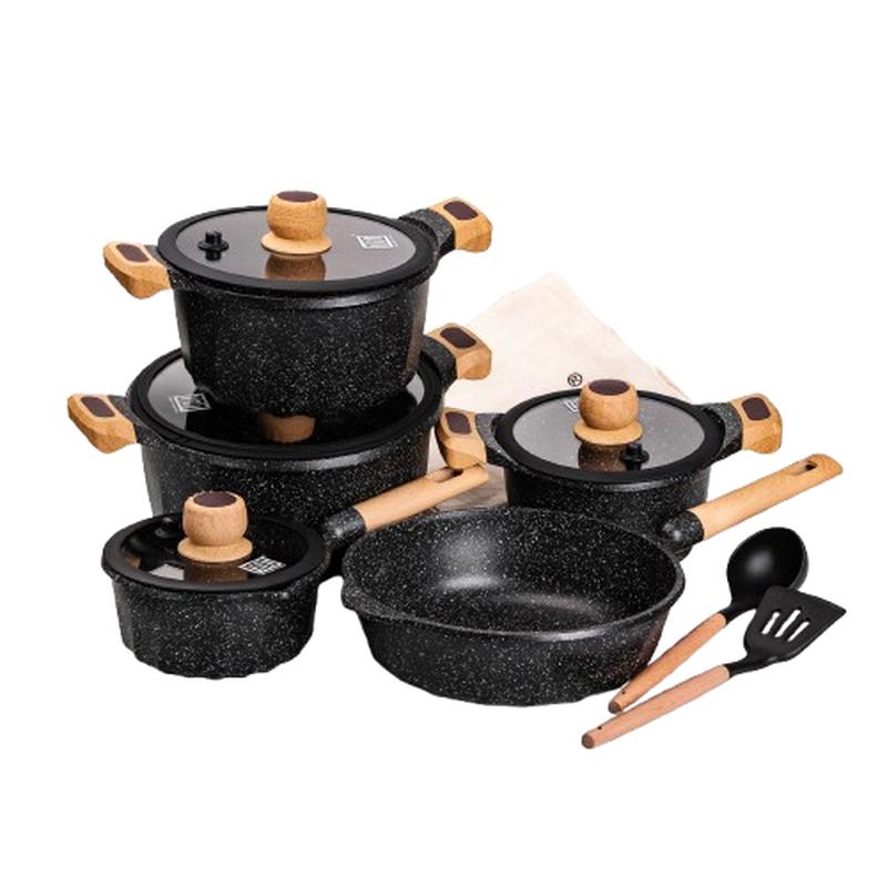 Набор посуды MGC 8 предметов с антипригарным покрытием 1,9/2/3/3,2/5,3 л, черный Набор посуды с антипригарным покрытием - отличный выбор для приготовления разнообразных блюд. Емкости изготовлены из литого алюминия, имеют утолщенное дно, которое равномерно нагревается и обеспечивает оптимальное распределение тепла. Основная особенность набора - возможность приготовления вкусной и здоровой пищи с минимальным использованием животных и растительных жиров. Для удобства использования в наборе есть стеклянные крышки с отверстием для выхода пара, позволяющие контролировать процесс приготовления с сохранением температуры. В набор входят: - Кастрюля 20 см (3 л) - Кастрюля 24 см (3,2 л) - Кастрюля 28 см (5,3 л) - Сотейник 18 см (2 л) - Сковорода 28 см (1,9 л) - Половник, кухонная лопатка - Брендированный фартук Особенности использования: 1. Перед первым применением вымыть предметы в теплой воде с мягким моющим средством и губкой, и высушить. 2. Для мытья после использования не следует применять жесткие мочалки, скребки, абразивные и агрессивные вещества. Для удаления пригоревших частичек пищи и нагара следует замочить посуду в теплой воде. Приступать к мытью следует только после ее остывания. 3. Мыть емкости в посудомойке рекомендуется на щадящем режиме. 4. Во время приготовления категорически не рекомендуется использовать металлические лопатки и ложки во избежание появления царапин, которые могут повлечь утрату антипригарных свойств. 5. Не следует подвергать кастрюли и сковороду перепадам температур. Чтобы избежать появления микротрещин, не стоит ставить посуду из холодильника на горячую плиту, помещать в разогретую емкость холодные ингредиенты и т.д. Характеристики: - Материал: алюминий - Материал крышки: закаленное стекло - Тип дна: композитное многослойное - Высота стенок: 5/9/7,7/11,2/13,2 см - Толщина стенок: 5 мм - Толщина дна: 5 мм - Подходит для газовых, индукционных и электрических плит