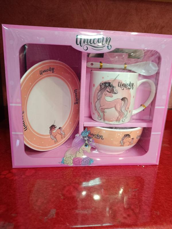 кухонный набор, очень красивый, лучший подарок, чашка, ложка, блюдца, тарелка под первые блюда, тарелка под столовые блюда, красивый рисунок, единорог