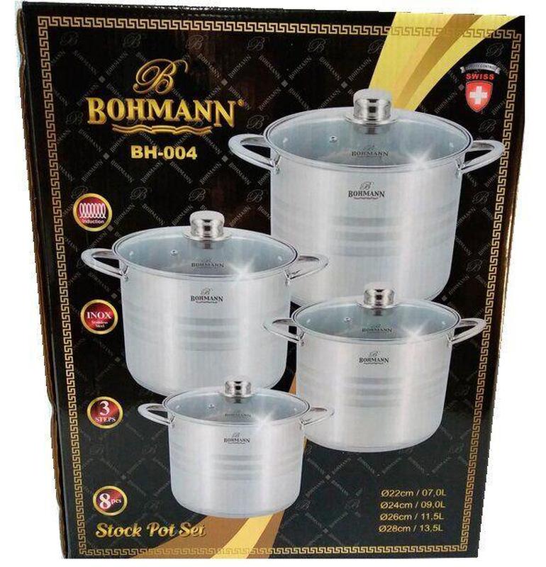 Набор посуды 8 предметов Bohmann BH 004 характеристика: Кастрюля с крышкой: объем- 7 л22см Кастрюля с крышкой: объем- 9 л24см Кастрюля с крышкой: объем- 11,5 л26см Кастрюля с крышкой: объем- 13,5 л28см Материал крышки: стекло Внутреннняя мерная шкала Материал: нержавеющая сталь Подходит для всех видов плит. Можно мыть в посудомоечной машине. Производитель: Bohmann Набор кастрюль Bohmann BH 004 из нержавеющей стали со стеклянной крышкой. Имеет многослойное термоаккумулирующее капсульное дно, которое быстро и равномерно накапливает тепло, а так же равномерно передает его пище. Подходит для всех видов плит, включая индукцию. Пароотвод на крышке.