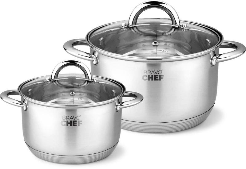 Набор посуды 4 предмета BRAVO CHEF BC-6001 Характеристика: Объём: 1.9, 3.6 л Диаметр: 16, 20 см Наличие крышки: да Материал: нержавеющая сталь Материал крышки: жаропрочное стекло Материал ручек: нержавеющая сталь Антипригарное покрытие: нет Наличие крышки: да Подходит для всех видов плит, включая индукционные Подходит для использования в посудомоечных машинах. Производитель: BRAVO CHEF