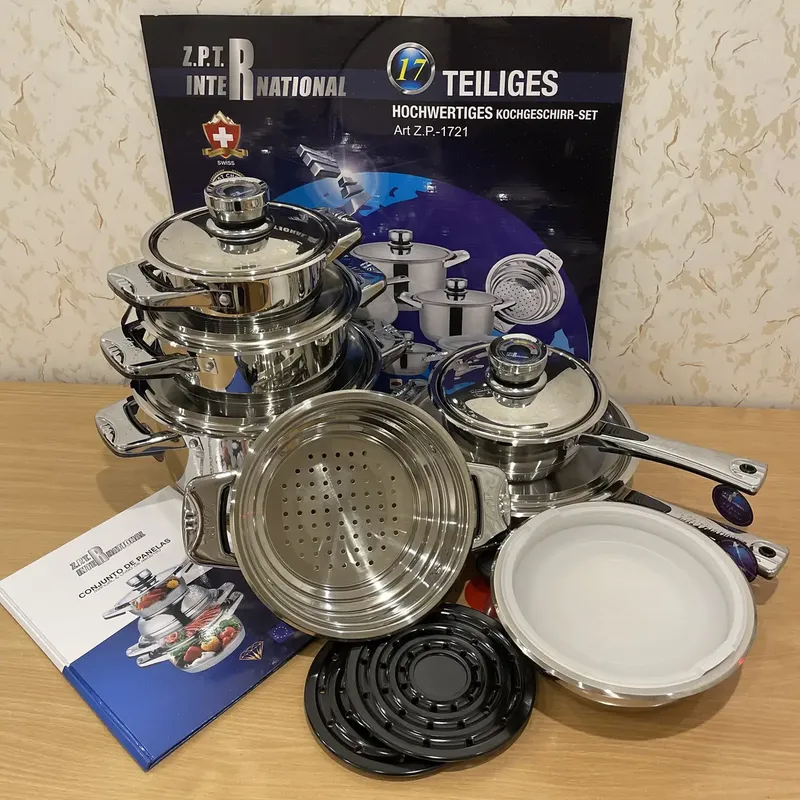 сковорода 24 см, каструлі: 1.6/3.1/6.5л, ківш 1.6л, миска для салату з нержавіючої сталі з пластиковою кришкою діаметром 20см, 2 бакелітових підставки під гаряче, пароварка з трьома діаметрами, яка підходить на всі каструлі ручку з присоскою. Комплектація: Сковорода 1шт Каструлі 3шт Ківш 1шт Миска для салату 1шт Бакалітова підставка під гараче 2шт Пароварка 1шт Заводська упаковка