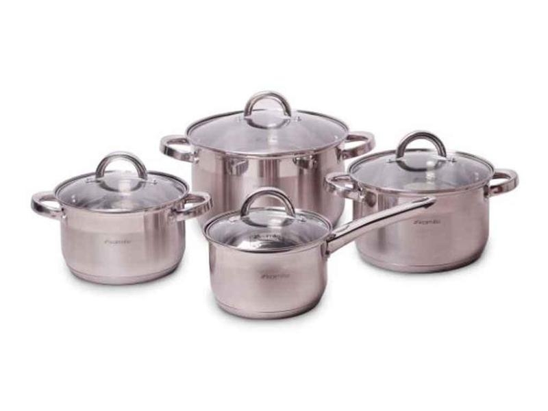 Материал: нержавеющая сталь. Материал крышки: жаропрочное стекло. Количество предметов в наборе: 8. Комплектация: ківш 2.1л (Ø16*10.5см), кастрюля 2.9л (Ø18*11.5см), кастрюля 3.9л (Ø20*12.5см), кастрюля 6.5л (Ø24*14.5см). Тип дна: 5-ти слойное. Мерная шкала: есть. Способ крепления ручек: клепочное соединение. Тип ручек: полые. Крышка с отверстием для выхода пара: да. Полировка металла: зеркальная/сатин. Тип плиты: электрическая, стеклокерамическая, индукционная, газовая. Подходит для мытья в пос